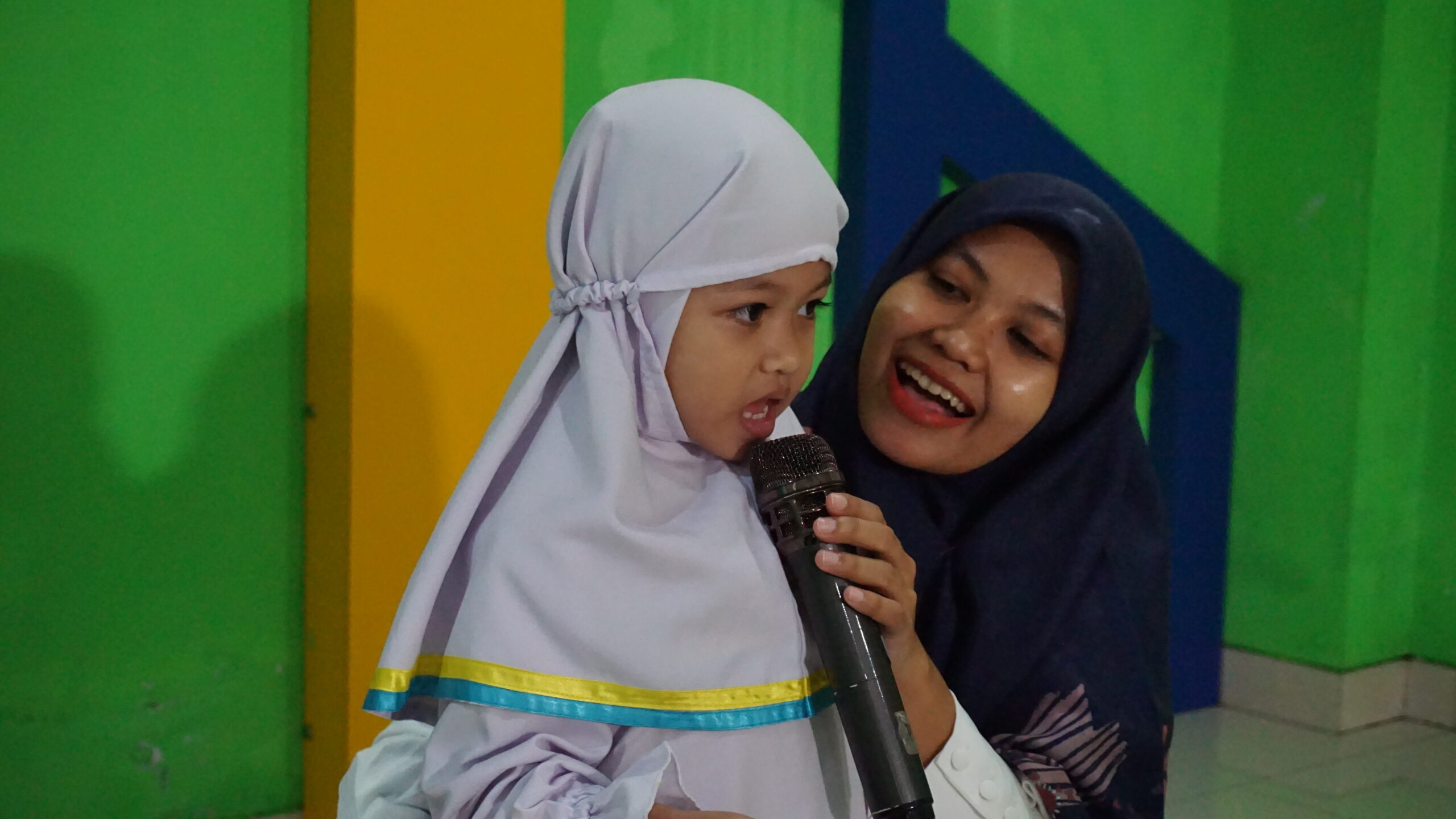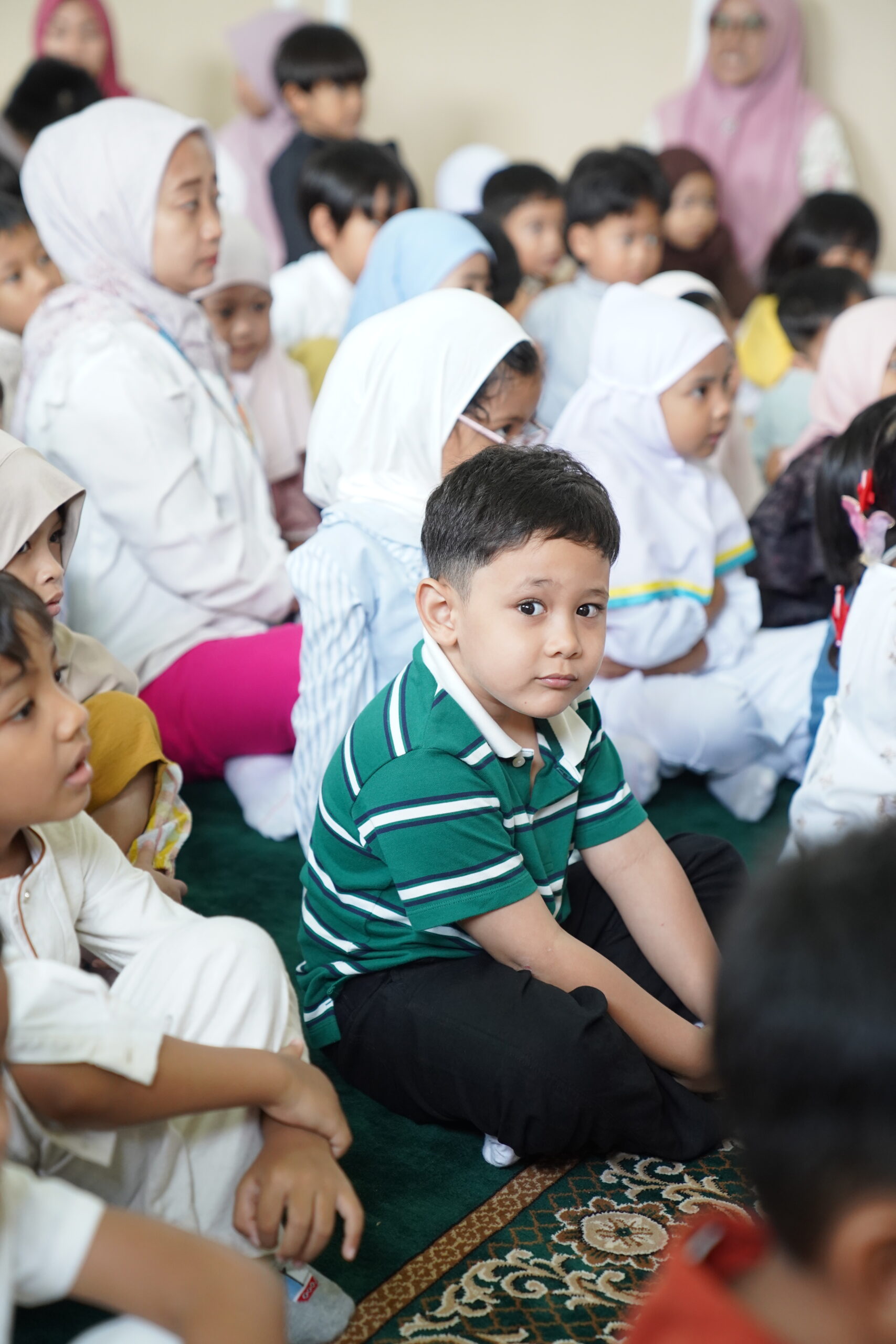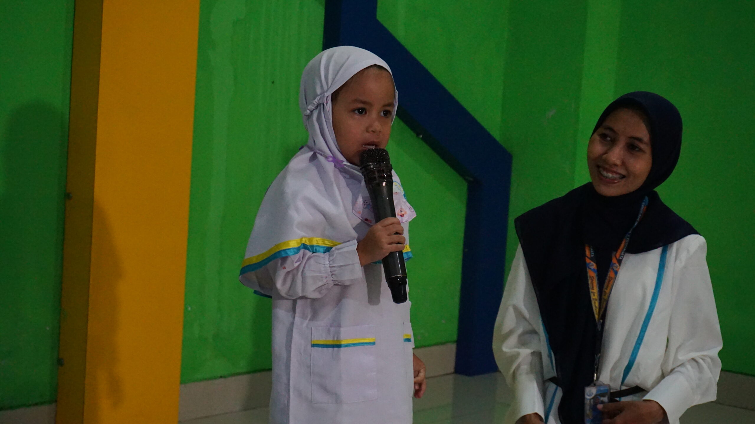 Sementara itu, siswa Kindy-1 melakukan lomba hafalan surat dan doa harian di musala PG-K. Secara bergantian, siswa maju mengalunkan hafalan mereka. Beberapa siswa tampak malu-malu, tetapi keberanian mereka berhasil mengalahkan perasaan malu itu.