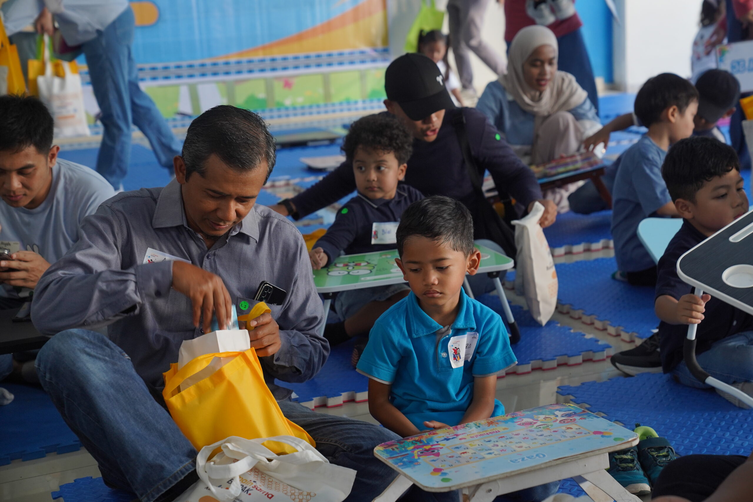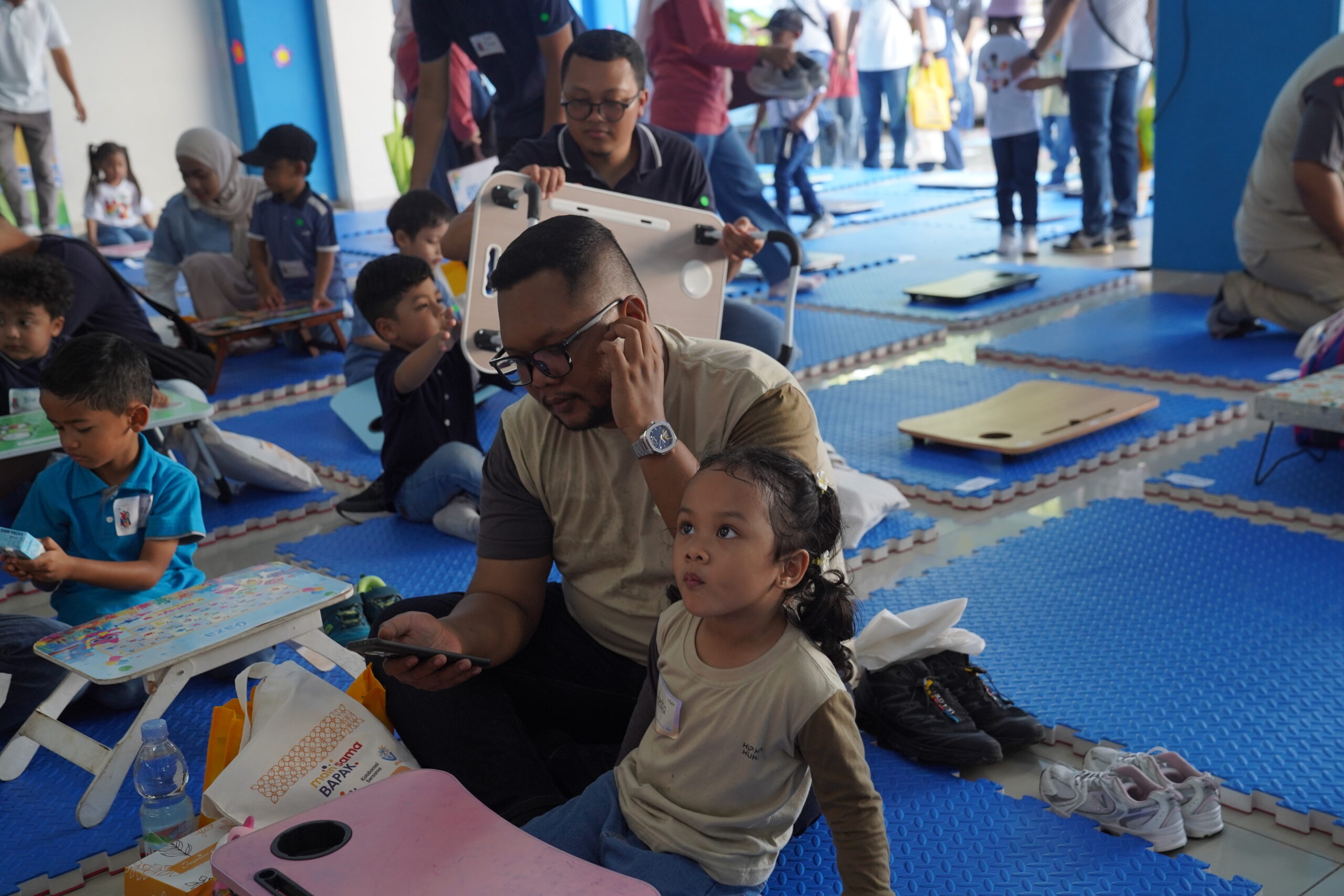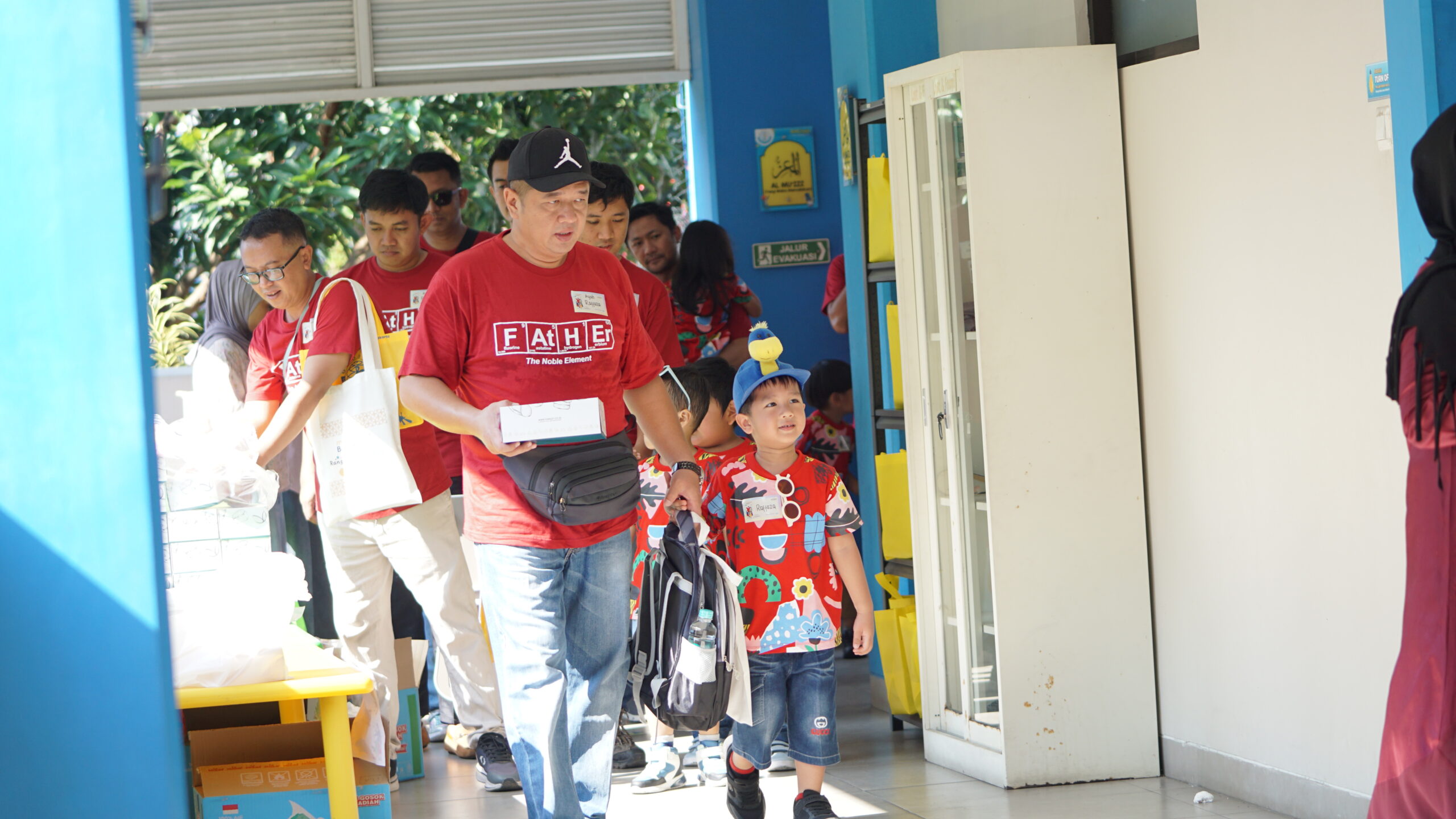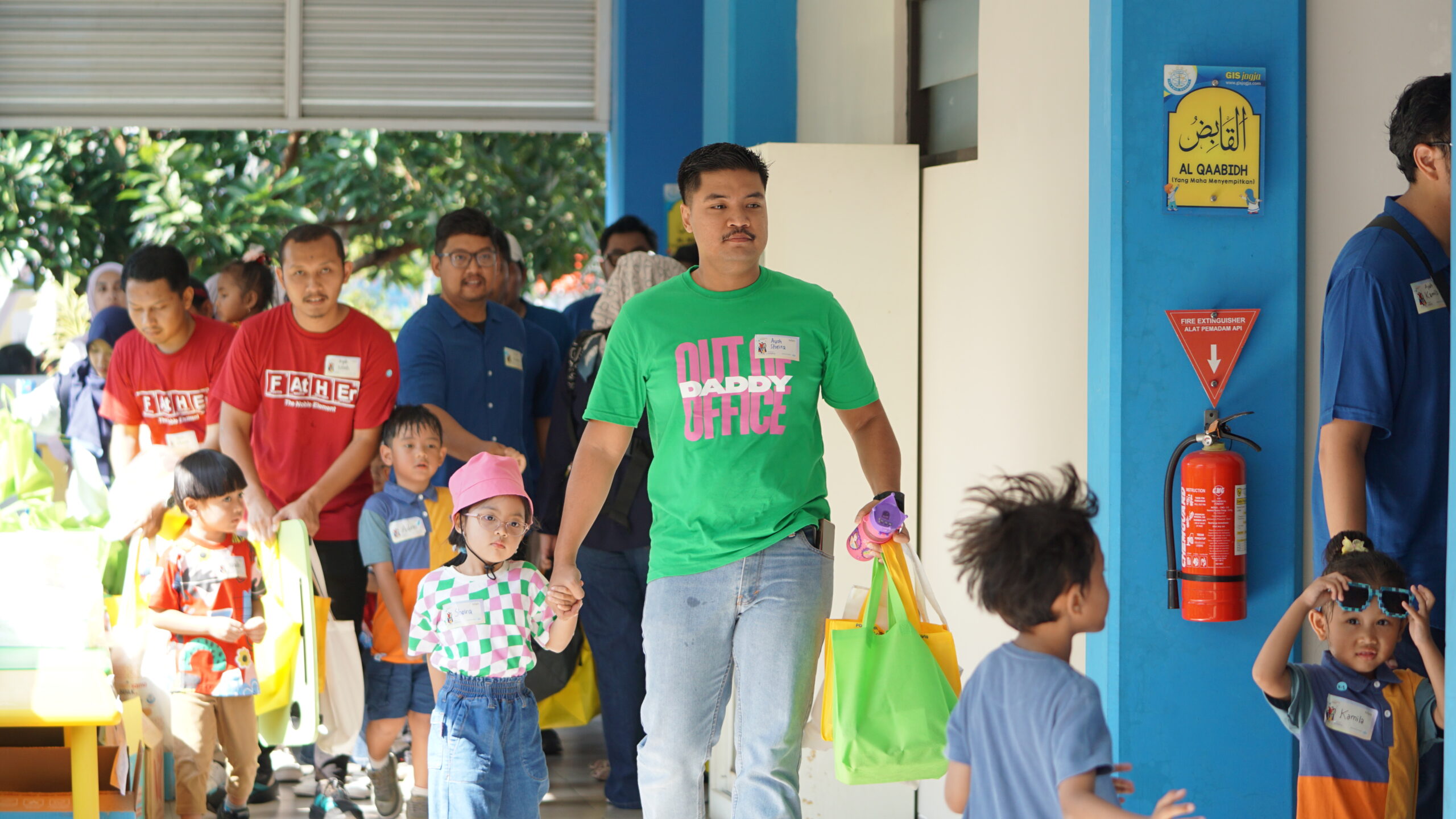 Ayah dan anak bergandengan tangan memasuki ruang kegiatan