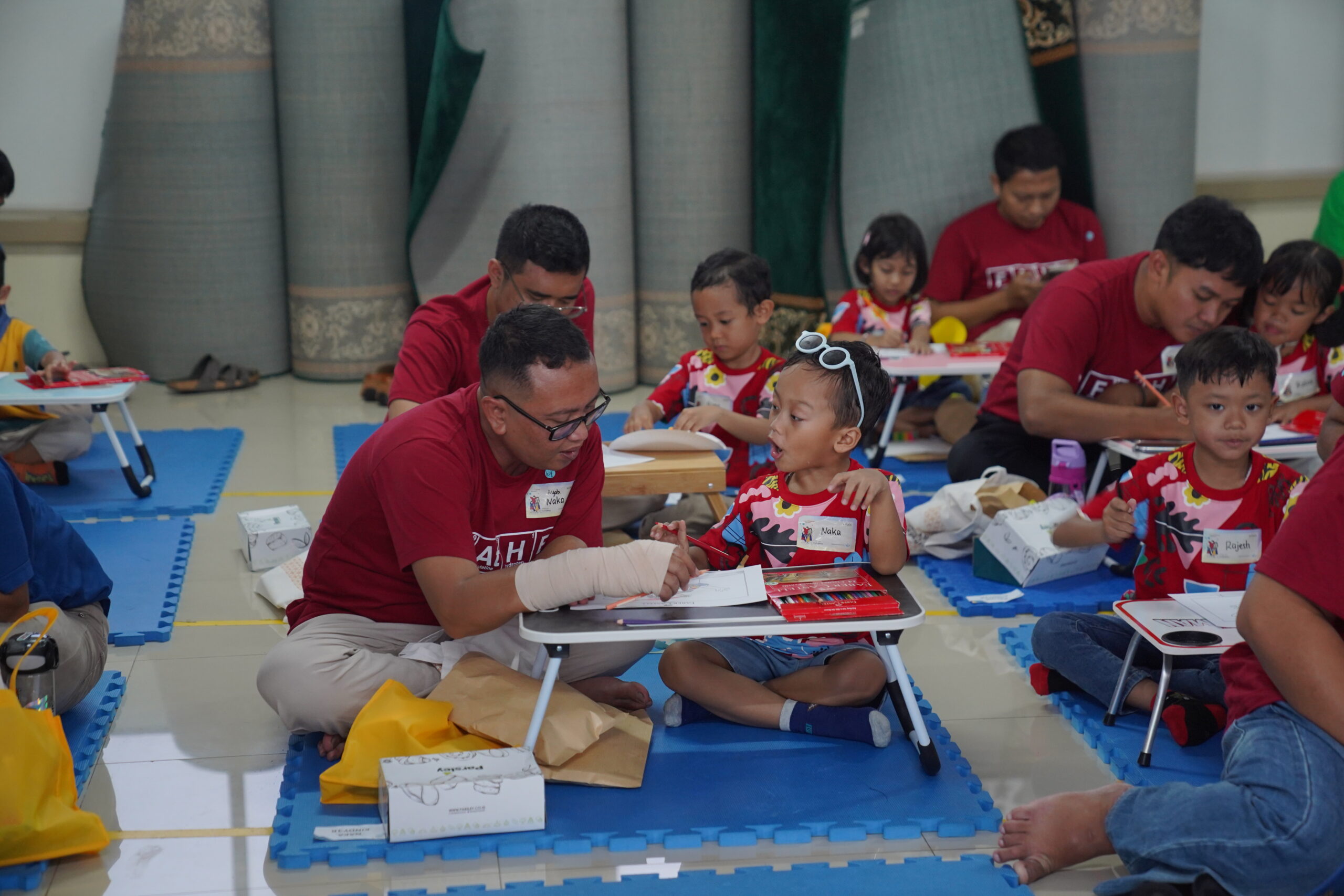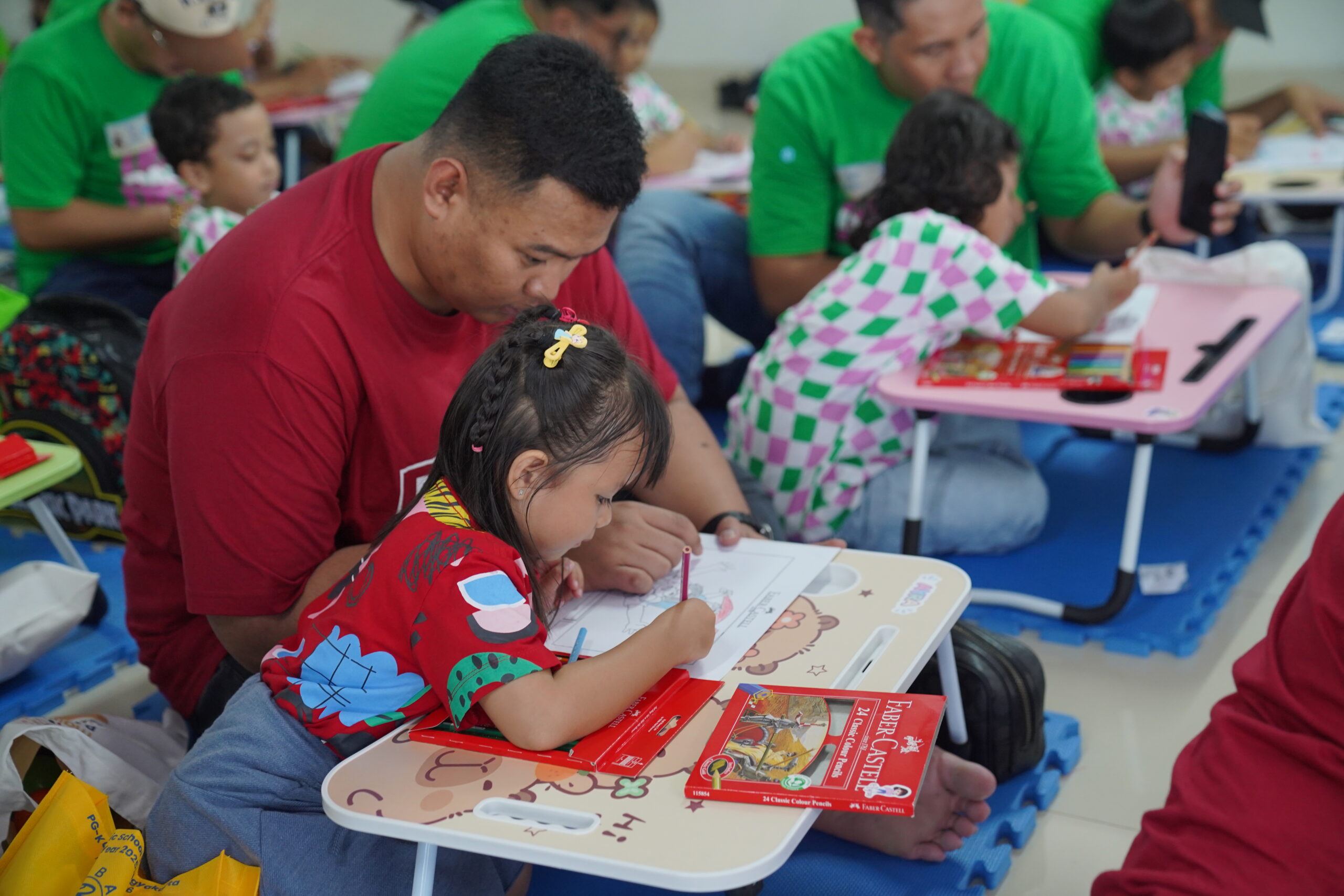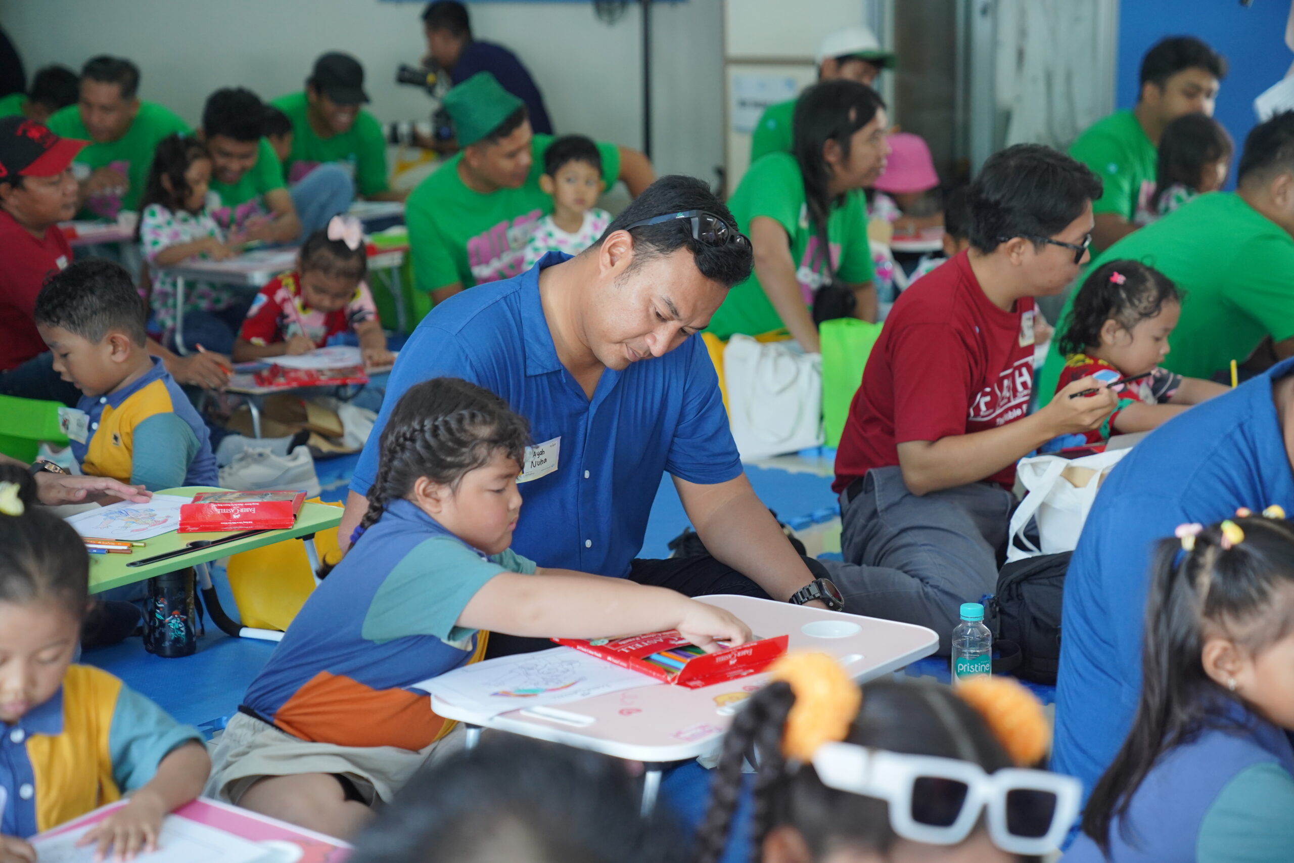 Suasana hangat segera tercipta melalui acara lomba mewarnai. Beberapa ayah tampak merangkul anaknya sambil membantu mewarnai, beberapa yang lain memerhatikan hasil goresan pensil warna sang anak dengan saksama. Kehadiran ayah di sisi anak bisa membuat anak lebih percaya diri dengan karya mereka.
