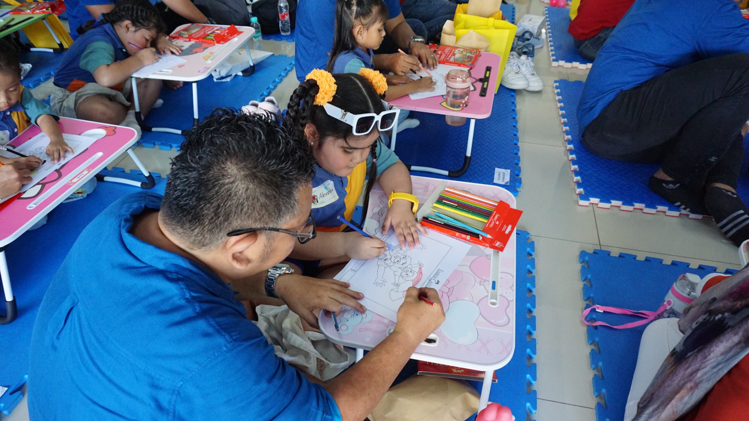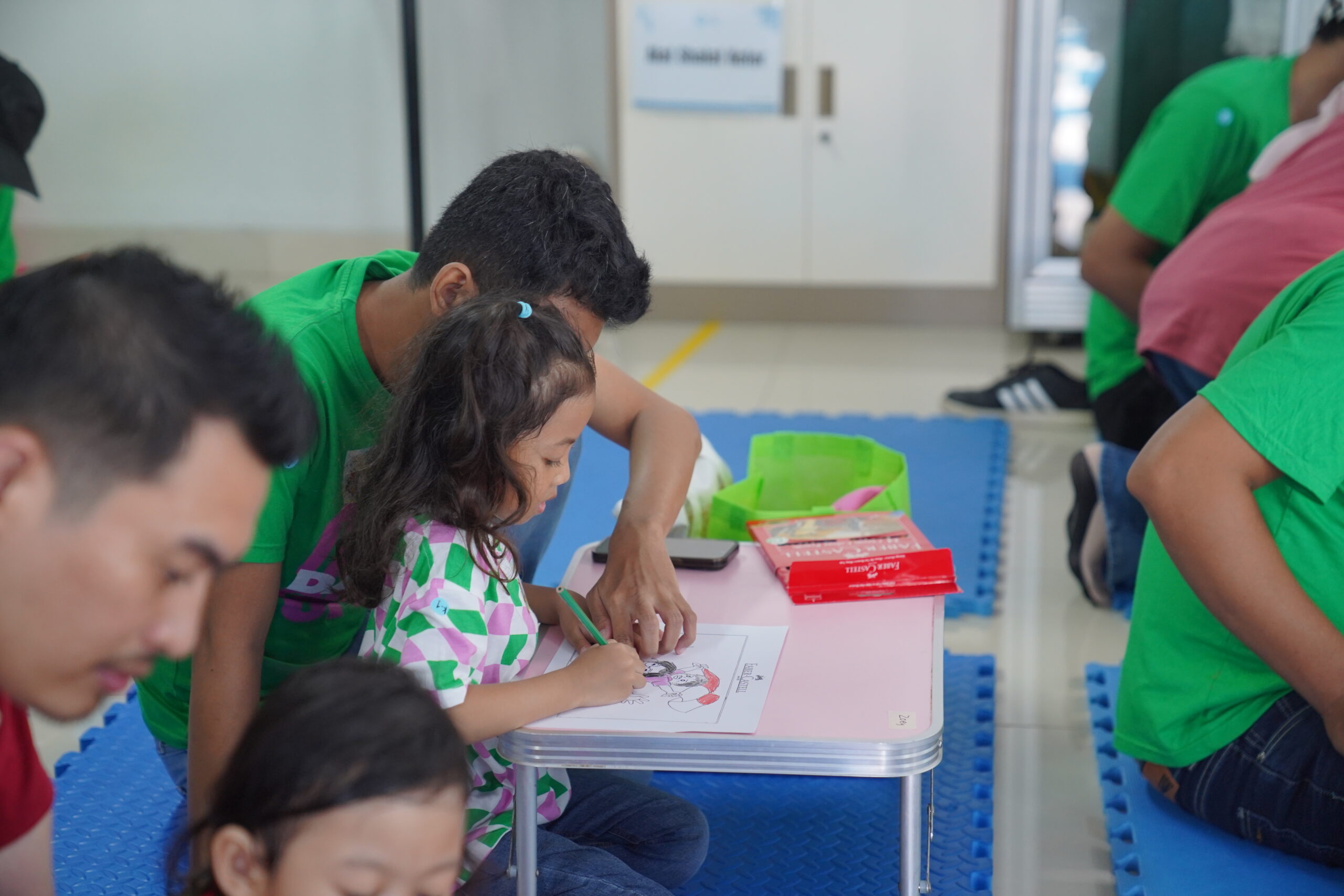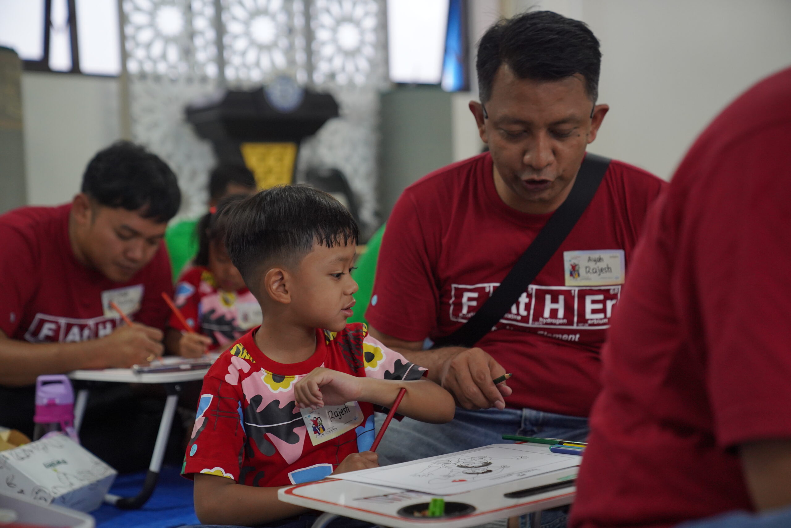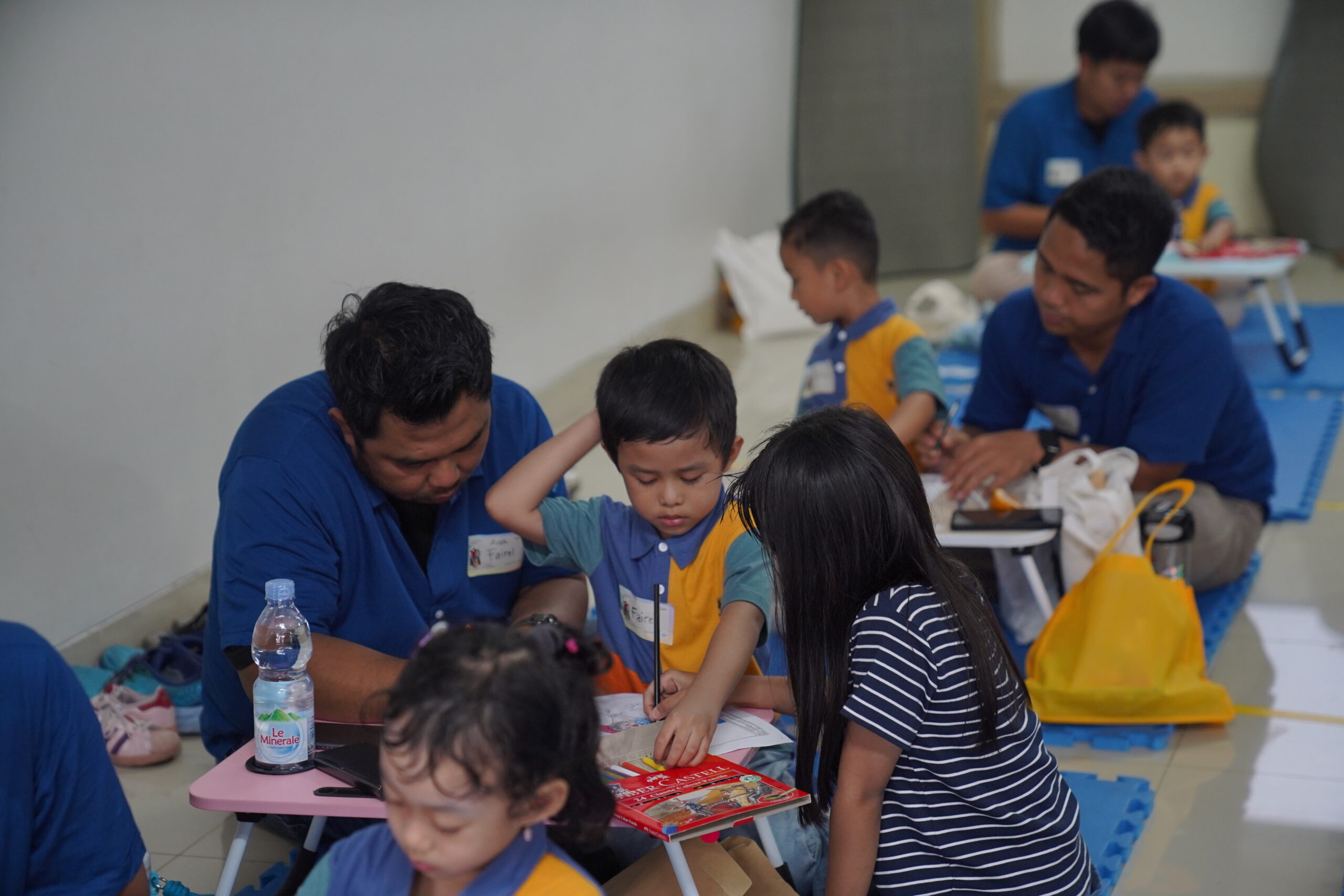 Suasana hangat segera tercipta melalui acara lomba mewarnai. Beberapa ayah tampak merangkul anaknya sambil membantu mewarnai, beberapa yang lain memerhatikan hasil goresan pensil warna sang anak dengan saksama. Kehadiran ayah di sisi anak bisa membuat anak lebih percaya diri dengan karya mereka.