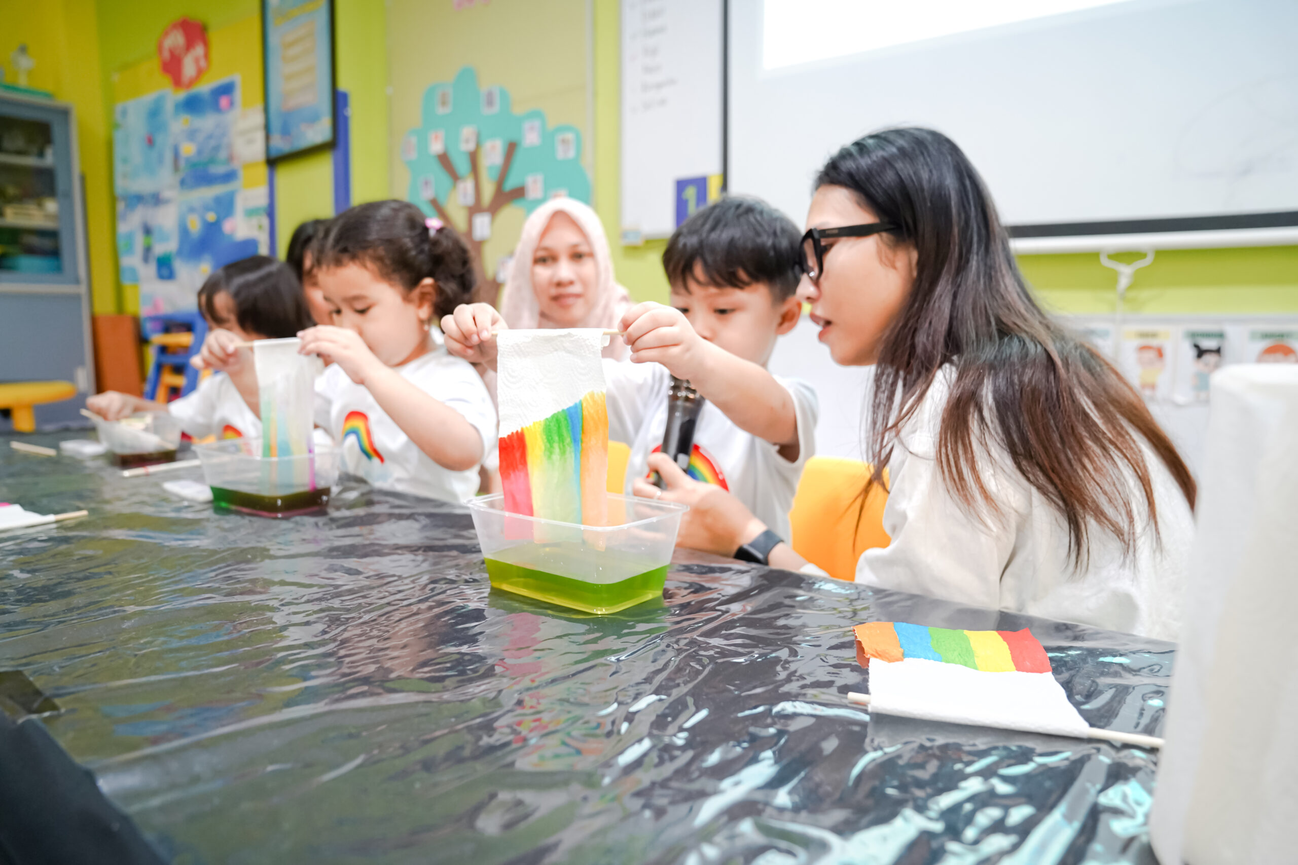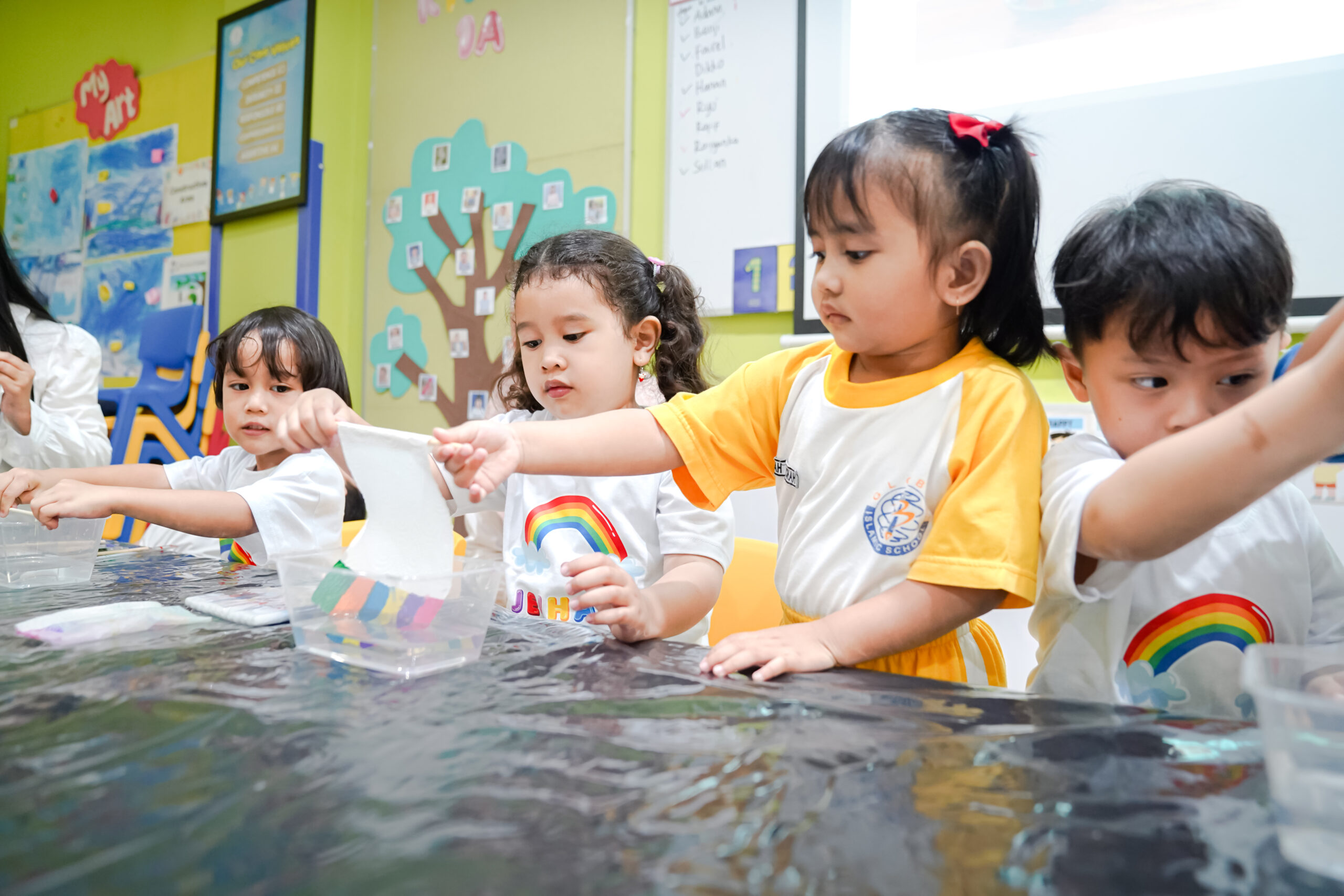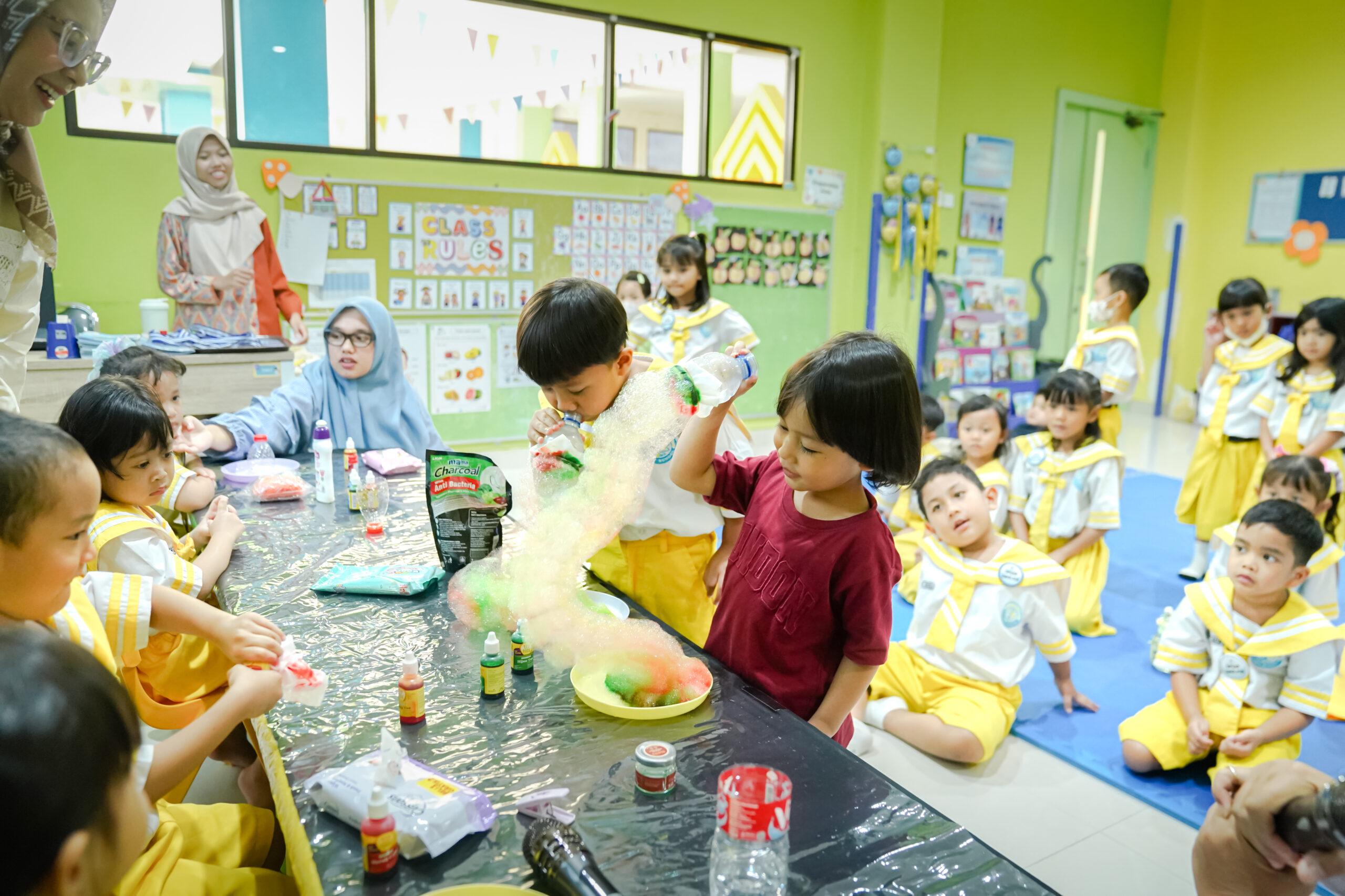 Tanpa menunggu lama, siswa-siswi presenter langsung memulai eksperimen dengan penuh semangat. Seketika, ruang-ruang kelas di PG-K GIS 3 Jogja menjelma menjadi “laboratorium” bagi para profesor cilik dari Playgroup dan Kindy-1
